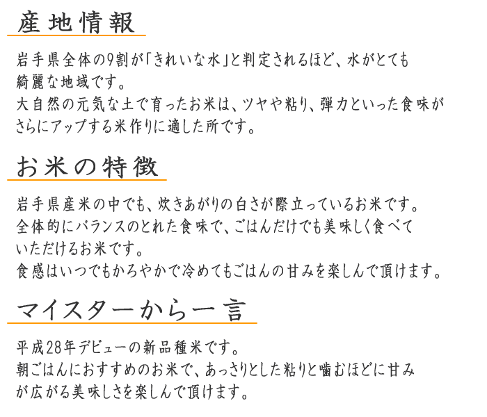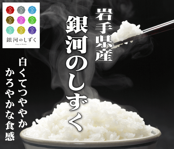 商品情報 名称 精米 / 玄米 産地 岩手県 品種 銀河のしずく 栽培方法 慣行栽培米 年産 令和2年産 使用割合 単一原料米 内容量 玄米 20kg(5kg×4) / 白米 18kg(4.5kg×4) 精米年月日 別途商品ラベルに記載 (基本的に発送日当日に精米) 商品取り置き 通常商品の取り置きはご購入日から30日間とさせて頂きます。