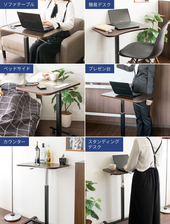 高さを70〜92cmと調整できるのでソファサイドやベッドサイドテーブルから、簡易カウンターやスタンディングデスク、プレゼン台(演台)まで幅広くお使いいただけます。