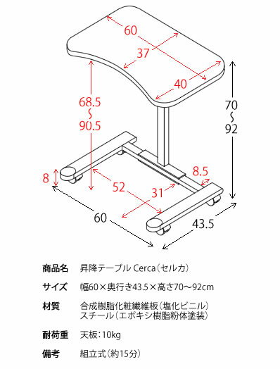 商品名 昇降テーブル Cerca(セルカ) サイズ 幅60×奥行き43.5×高さ70〜92cm 材質 合成樹脂化粧繊維板(塩化ビニル)スチール(エポキシ樹脂粉体塗装) 耐荷重 天板:10kg 備考 組立式(約15分) 配送について ※こちらの商品はメーカー直送の為、代引でのお取扱いができません。