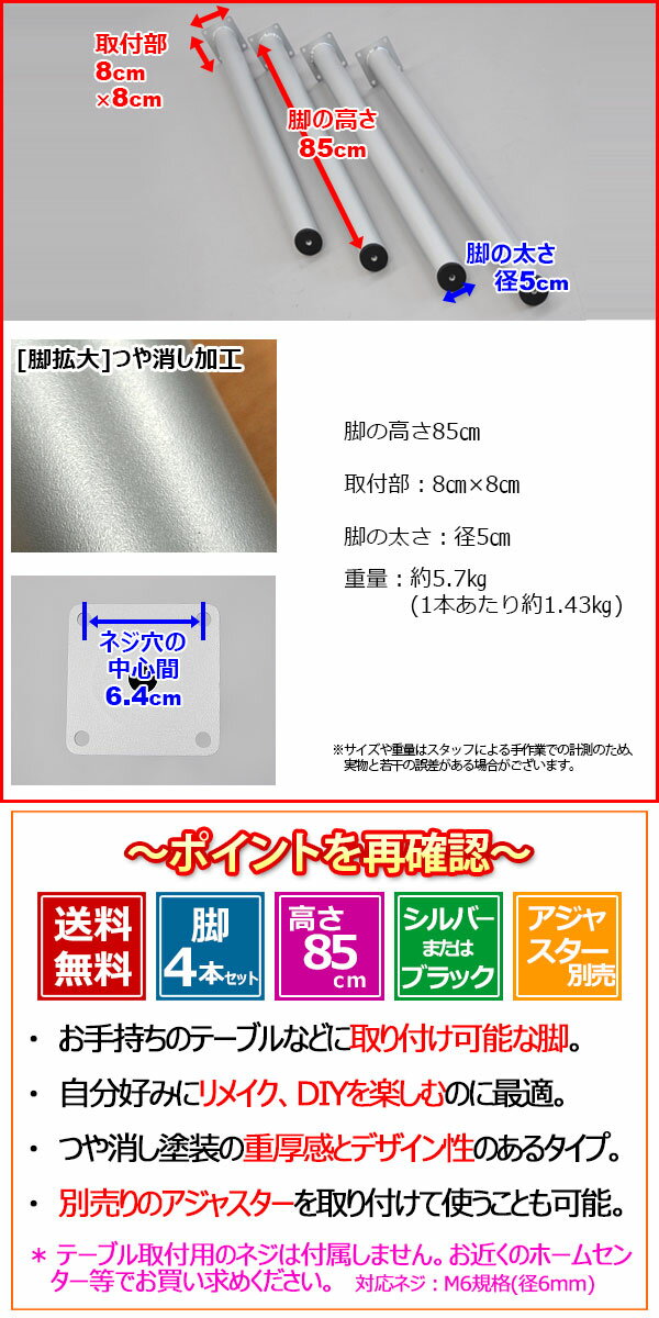 (稀にネジが付属している場合がございますが、専用テーブル天板用のネジのため、他のテーブル天板には使用できません) テーブル 脚 パーツ 85cm(4本セット)の詳細 ■サイズ 脚の高さ:85cm脚の直径:5cm取り付け部のプレート:8cm×8cm※取り付けネジ穴の中心間:約6.4cm※別売りのアジャスターを取り付けると高さは86.2cm〜となります。